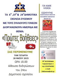 Ο Σύλλογος Γονέων και Κηδεμόνων του 24ου Δημοτικού Ευόσμου με μεγάλη χαρά ανακοινώνει τη διοργάνωση των School Games 2025, μιας μεγάλης γιορτής που φιλοδοξεί να προσφέρει σε όλα τα παιδιά του σχολείου…20 Μαΐου 2025Οργάνωση σεμιναρίου Πρώτων βοηθειών