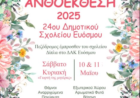 Μια γιορτή της φύσης για μικρούς και μεγάλους! Ο Σύλλογος Γονέων και Κηδεμόνων του 24ου Δημοτικού Σχολείου Ευόσμου διοργανώνει «Ανθοέκθεση», γεμάτη χρώματα και άνοιξη, το Σάββατο 10 και την Κυριακή 11…