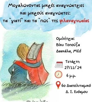 Σας προσκαλούμε την Τετάρτη 27/11/’24 και ώρα 6 μ.μ. σε ομιλία με θέμα: Μεγαλώνοντας μικρές αναγνώστριες και μικρούς αναγνώστες: τα “γιατί” και τα “πώς” της φιλαναγνωσίας. Ομιλήτρια: Βίκυ Τοπούζα, Δασκάλα/ΜEd Eλάτε να…