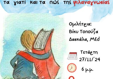 28 Νοεμβρίου 2024Μεγαλώνοντας μικρές αναγνώστριες και μικρούς αναγνώστες: τα “γιατί” και τα “πώς” της φιλαναγνωσίας.